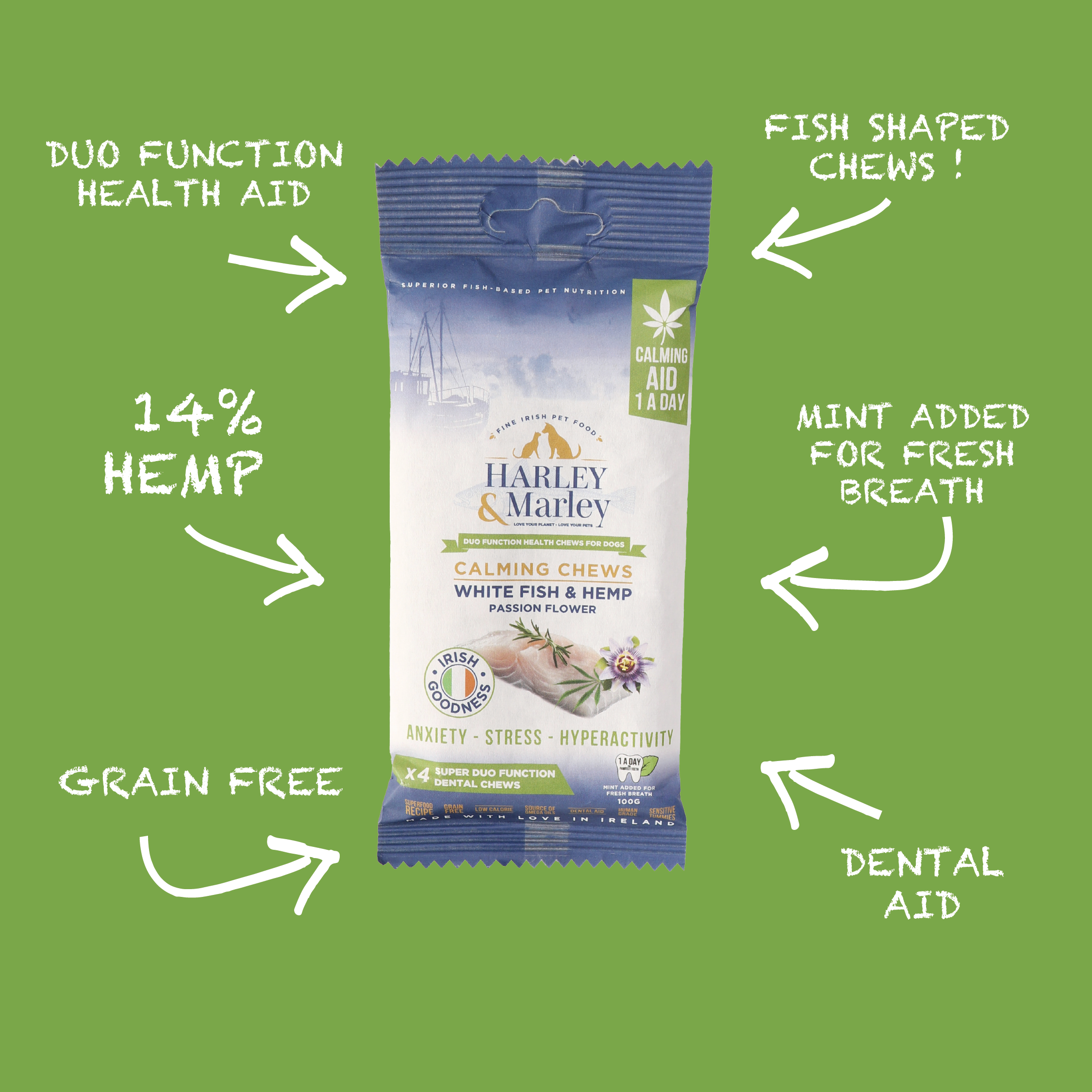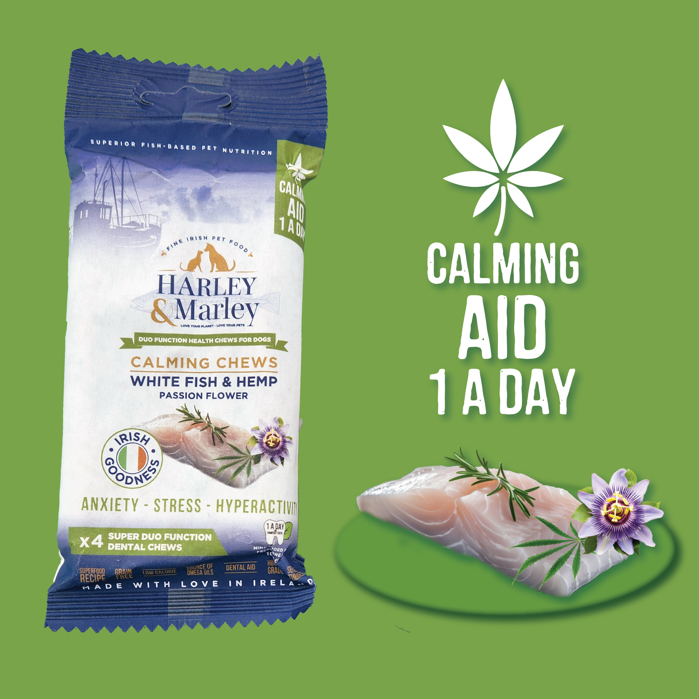 These Harley & Marley Duo Function Health Chews are specifically designed for Calming your fur babies. The zen ingredients in these Health Chews will help bring peace to your pups - White Fish & Hemp with Passion Flower. White Fish is particularly low in saturated fat and easy to digest – a great option for dogs with sensitive tummies or allergies. Hemp can reduce anxiety and promote calmer behaviour. The anti-inflammatory properties in Hemp mean it can help dogs suffering from painful conditions like arthritis, and even offer natural pain relief for those who need it. Dogs can experience anxiety and stress from a number of situations. Passion Flower is commonly used for relieving anxiety. It works by raising levels of Gamma-Aminobutyric Acid in the brain. This in turn lowers other particular brain cell activity, which puts the body in a calmer more relaxed state. Passionflower also boosts Serotonin and Dopamine levels in the body. Overall the combined calming relief of Hemp & Passionflower provides gentle relief from anxiety and tension, helping dogs feel more at ease and comfortable in stressful situations. Aside from the functional health benefits mentioned above, these Harley & Marley Duo Function Health Chews also support Healthy Teeth and Gums, as well as Fresh Breath. Packed with Natural Goodness, they are Grain-Free, Low Calorie, Human Grade and contain No Added Sugar or Artificial Flavours or Colourings. We are confident your Fur Babies will enjoy our 100% Natural Health Chews Made with Love in Ireland.