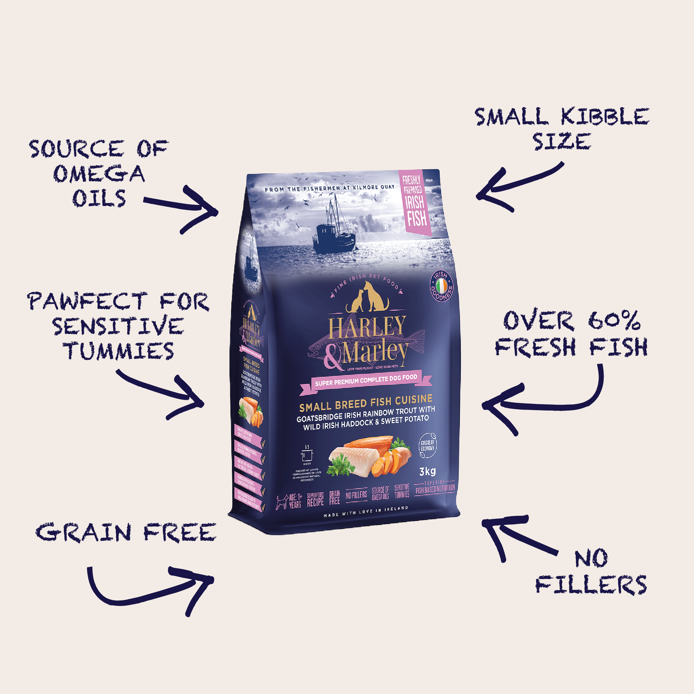 Harley & Marley Superior Fish-Based Nutrition offers "A Tidal Wave of Fish-Tastic Benefits!" We hand-make our product with love in Ireland, and we believe in taking care of both your pets and the planet.