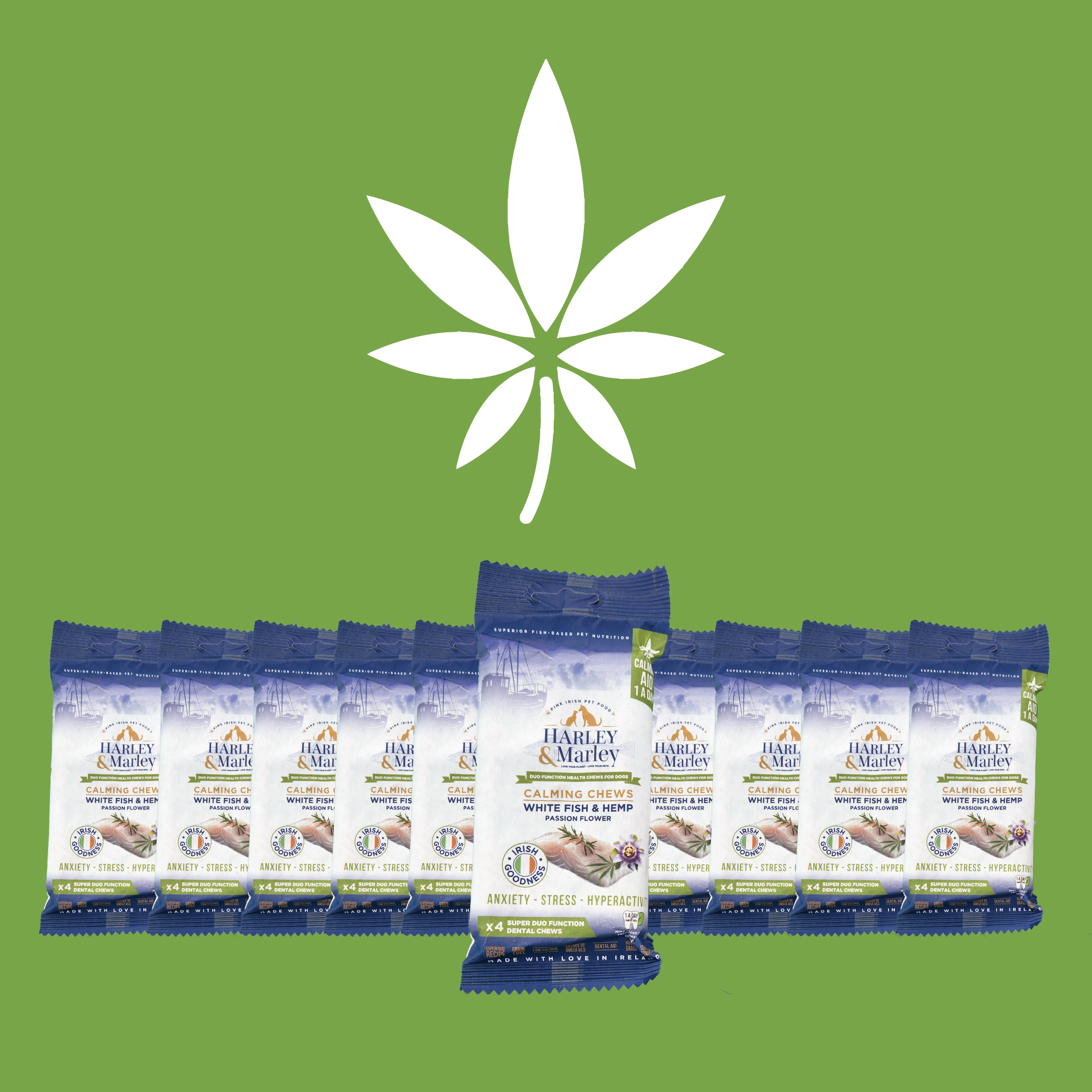 These Harley & Marley Duo Function Health Chews are specifically designed for Calming your fur babies. The zen ingredients in these Health Chews will help bring peace to your pups - White Fish & Hemp with Passion Flower. White Fish is particularly low in saturated fat and easy to digest – a great option for dogs with sensitive tummies or allergies. Hemp can reduce anxiety and promote calmer behaviour. The anti-inflammatory properties in Hemp mean it can help dogs suffering from painful conditions like arthritis, and even offer natural pain relief for those who need it. Dogs can experience anxiety and stress from a number of situations. Passion Flower is commonly used for relieving anxiety. It works by raising levels of Gamma-Aminobutyric Acid in the brain. This in turn lowers other particular brain cell activity, which puts the body in a calmer more relaxed state. Passionflower also boosts Serotonin and Dopamine levels in the body. Overall the combined calming relief of Hemp & Passionflower provides gentle relief from anxiety and tension, helping dogs feel more at ease and comfortable in stressful situations. Aside from the functional health benefits mentioned above, these Harley & Marley Duo Function Health Chews also support Healthy Teeth and Gums, as well as Fresh Breath. Packed with Natural Goodness, they are Grain-Free, Low Calorie, Human Grade and contain No Added Sugar or Artificial Flavours or Colourings. We are confident your Fur Babies will enjoy our 100% Natural Health Chews Made with Love in Ireland.