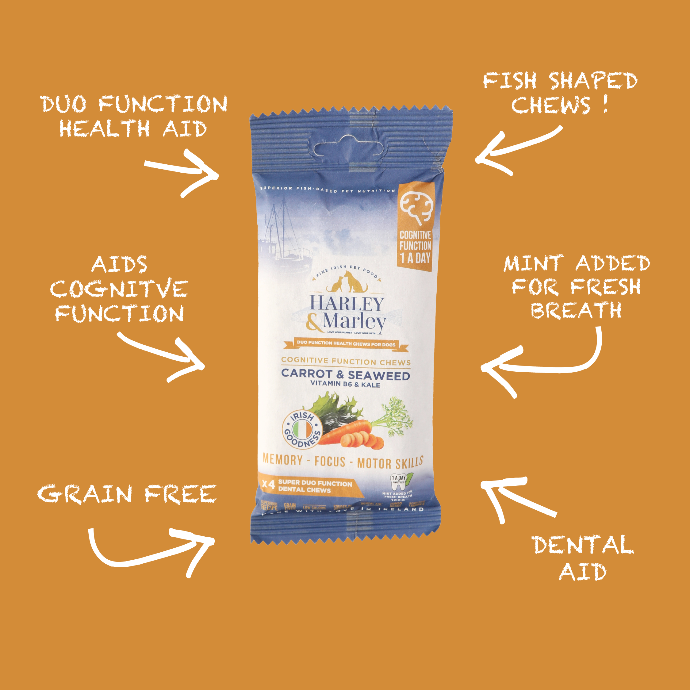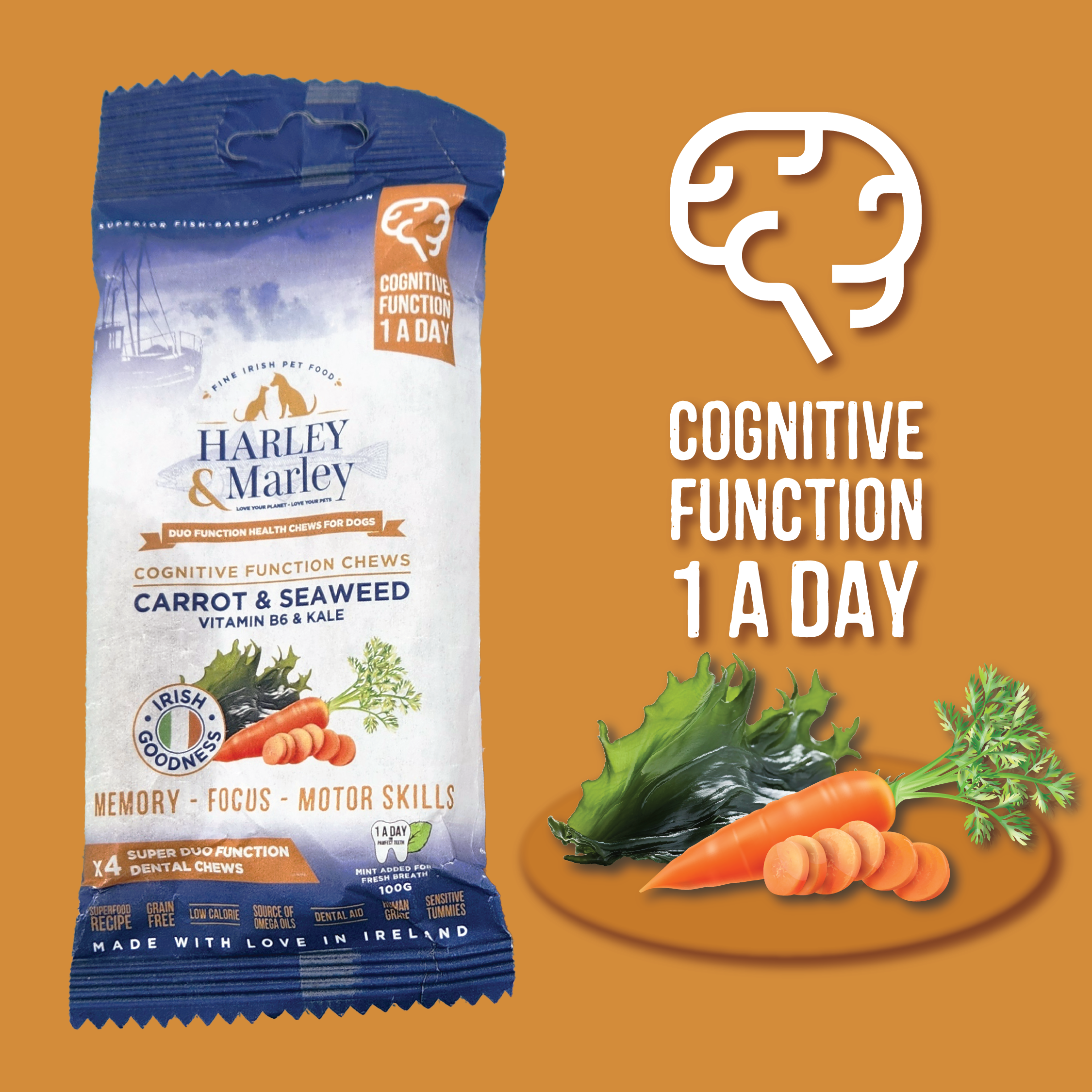 These Harley & Marley Duo Function Health Chews are specifically designed to support your pup's Cognitive (Brain) Function. The healthy Carrot & Seaweed recipe, with Vitamin B6 & Kale, provides nutrients that support overall health, including brain function.