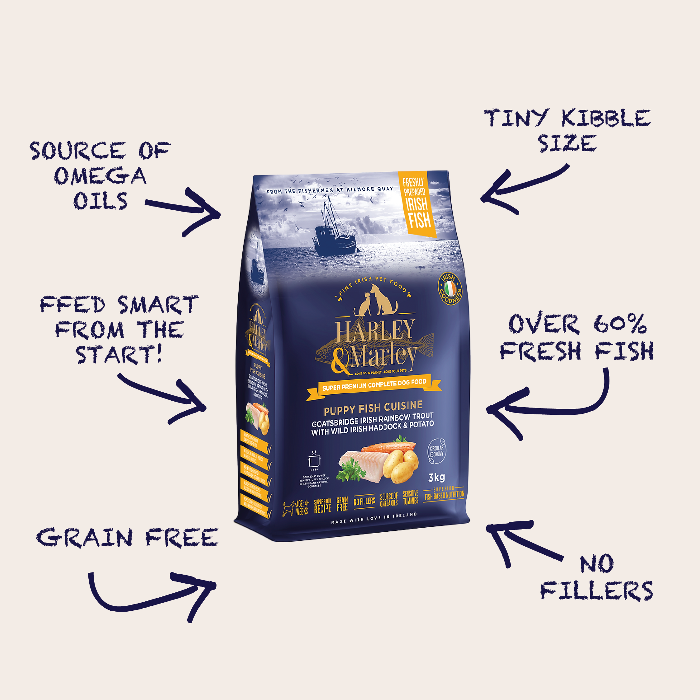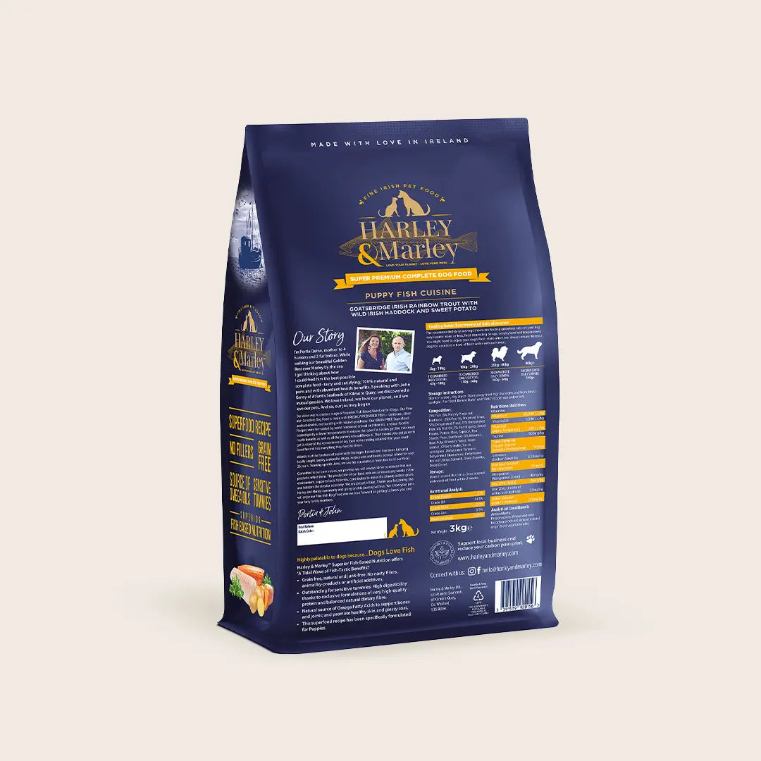 Harley & Marley Superior Fish-Based Nutrition offers "A Tidal Wave of Fish-Tastic Benefits!" We hand-make our product with love in Ireland, and we believe in taking care of both your pets and the planet.