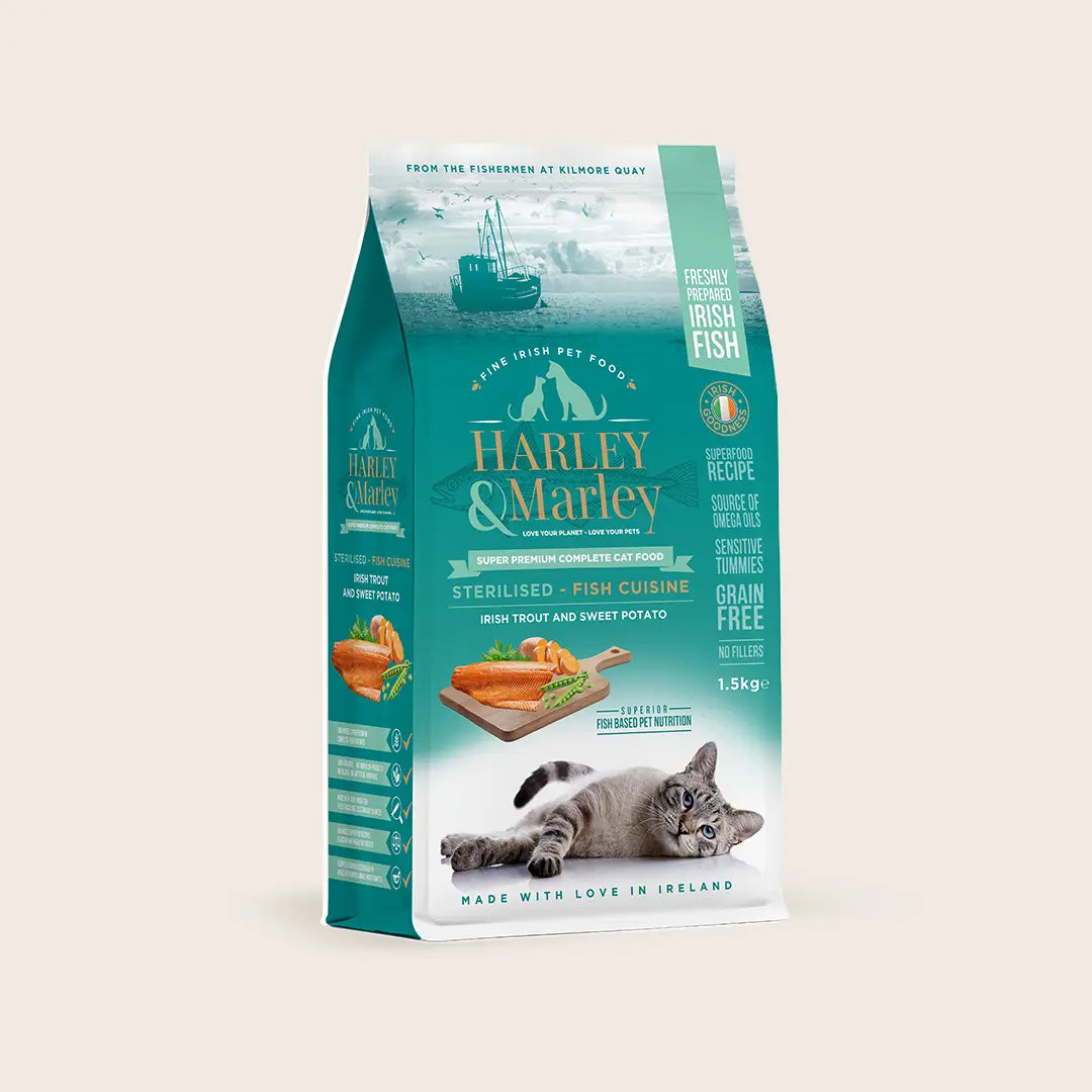 Introducing a Complete Fish Cuisine specially formulated for Sterilised Cats that is Grain-Free and Super Premium. Made from delicious Wild Irish Trout & Sweet Potato. Our Superfood Recipes were created by world-renowned animal nutritionists, and our food is cooked at lower temperatures to lock in the maximum natural goodness. Our food is a Natural Source of Omega Oils that support Healthy Bones and Joints; Promote Healthy Skin and give your cat a Glossy Coat. Our food is free of junk and nasty fillers, and is packed with Freshly Prepared, delicious, clean, and sustainable fish from the Fishermen at Kilmore Quay. Perfect for Sensitive Tummies & cats with allergies too! The abundant functional health benefits our food offers are derived from the Natural Goodness of its high-quality ingredients, and our recipes are designed to Help Your Pet Live a Long, Happy, and Healthy Feline Life! Harley & Marley Superior Fish-Based Nutrition offers "A Tidal Wave of Fish-Tastic Benefits!" We make our products with love in Ireland, reducing seafood waste and proudly supporting the circular economy. We believe in taking the greatest possible care of your pets as well as the positive impact the making of our products has on our beautiful blue planet.